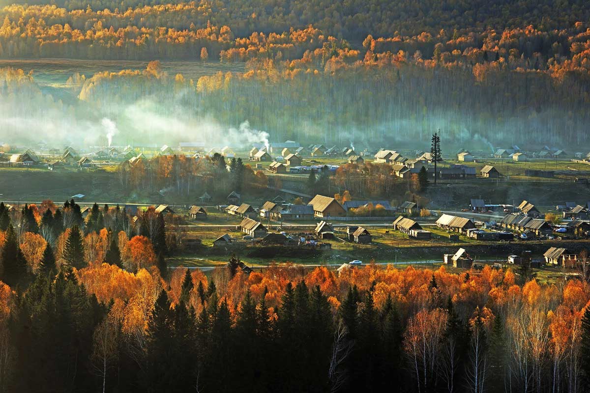 照片拍攝於新疆布爾津縣喀納斯禾木景區。禾木村,素有“中國第一村”的美稱,是僅存的三個圖瓦人村落集中生活的居住地。禾木村最出名的就是萬山紅遍的醉人秋色,炊煙在秋色中冉冉升起,形成一條夢幻般的煙霧帶,勝似仙境。