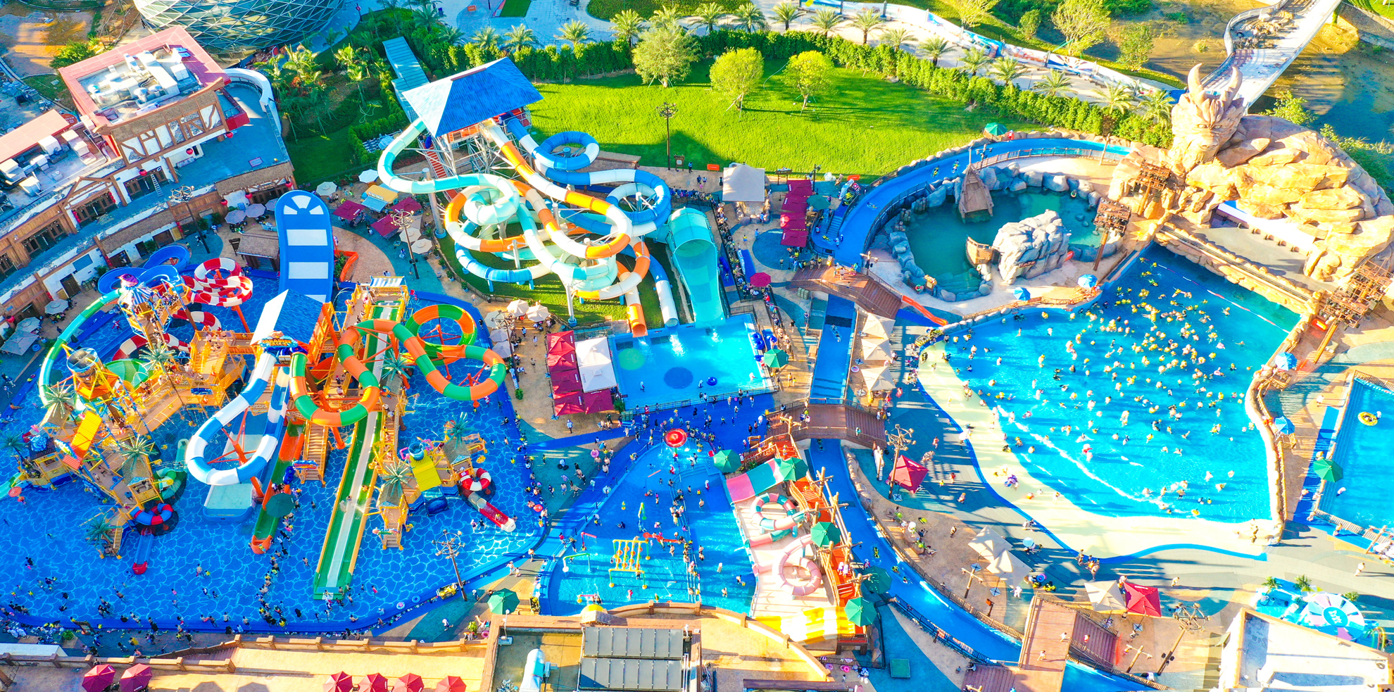 這座大型綜合水上互動娛樂中心完美融合在地文化和國際遊樂體驗,集激爽遊樂和精彩演藝於一體,擁有多項首創遊樂专案,遊樂設施均由全球頂級的加拿大白水公司設計生產。中國首台進口裂口式大喇叭“挑戰龍捲風”、國內滑道最豐富的超級大水寨“海灣水寨”、千平米造浪池“決戰海嘯”、體驗豐富的滑道組合“玄武大滑梯”等王牌专案將再次帶來酣暢淋漓的潮玩體驗。同時,专案團隊將持續豐富餐商服務、升級遊樂體驗、提質主題演藝,致力於以世界一流品質標準的遊樂服務迎接每一位遊客。