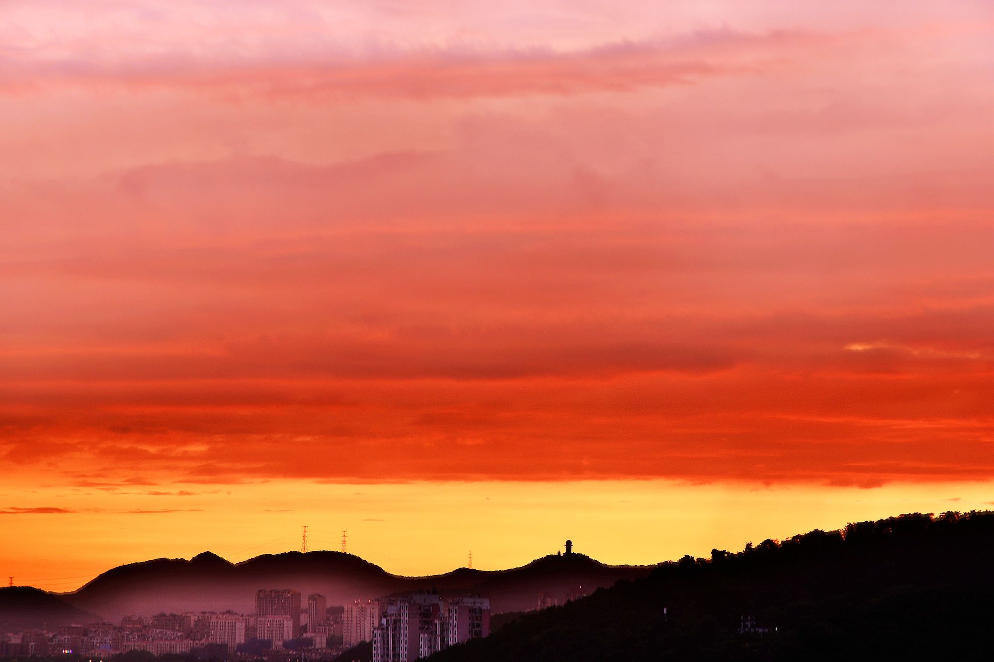 ▲ 又是一張優秀的紅霞,紅霞很難在設備中得到還原,並不是很多人想象的加強飽和度就能解決。這張照片紅霞不僅顏色絢麗,並且畫面從近到遠還有色彩的過渡,其次天空沒有出現過曝,唯一讓我猶豫的是左下角的城市感覺被很拙劣得提亮了暗部。我特地看了作者的描述。那是籠罩在城市的薄霧,如紗般輕柔。右下角的山毫無細節反而是正常的。